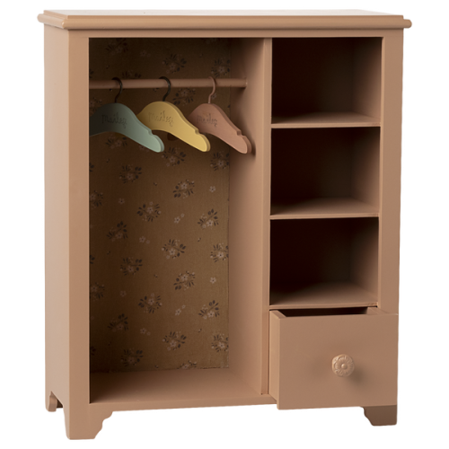 Drewniana szafa w stylu Vintage w kolorze DARK POWDER dla lalek i królików duńskiej firmy Maileg. Drewniana szafa na ubranka dla króliczków i misiów lub po prostu na ulubione skarby. Ma idealny rozmiar, aby umieścić ją w dowolnym miejscu w pokoju dziecięcym, ponieważ jest za duża do domków dla lalek Maileg. W środku szafy znajdują się półeczki na ubranka oraz drążek z 3 wieszakami.