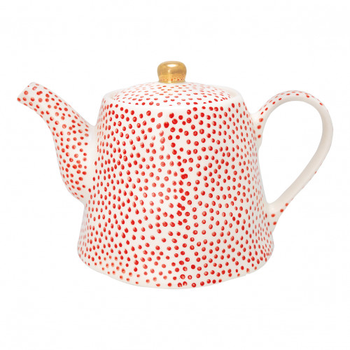 Ceramiczny dzbanek w kolorze białym ozdobiony czerwonymi kropeczkami ze złotym wykończeniem firmy Green Gate. Uroczy czajniczek do serwowania herbatki lub kawy, ręcznie wykończony. Picie z tej pięknej duńskiej ceramiki stanie się nie tylko doznaniem smakowym, ale i ucztą dla oczu. Dzbanek sam w sobie stanowi przeuroczą dekorację kuchni lub wspaniały prezent dla osób ceniących piękno i wysoką jakość przedmiotów codziennego użytku. Stworzy wyjątkowy zestaw z pozostałymi seriami porcelany Green Gate.