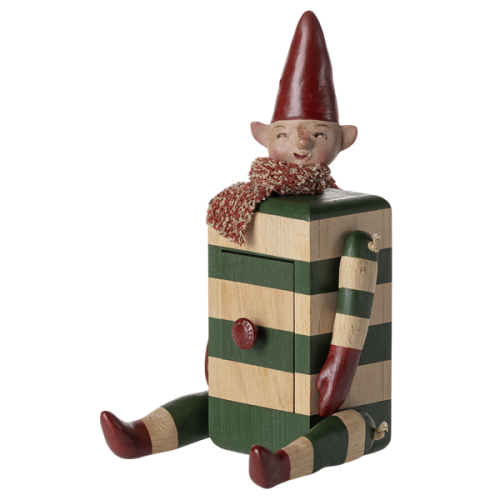 ELF z szufladką w kolorze zielonym od Maileg. Ten piękny przedmiot dekoracyjny to prawdziwy klasyk, który został zdefiniowany na nowo dzięki nowym szczegółom, które nadają produktowi wyjątkowy wyraz. Otwórz małą szufladkę i ukryj małe prezenty lub smakołyki. Każda figurka jest zapakowana w pudełko prezentowe.