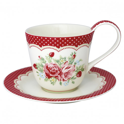 Porcelanowa filiżanka ze spodkiem w kolorze biało-czerwono-zielonym ozdobiona kwiatowym wzorem firmy Green Gate. Picie kawy lub herbaty z tej pięknej duńskiej porcelany stanie się nie tylko doznaniem smakowym, ale i ucztą dla oczu. Filiżanka sam w sobie stanowi przeuroczą dekorację kuchni lub wspaniały prezent dla osób ceniących piękno i wysoką jakość przedmiotów codziennego użytku. Stworzy wyjątkowy zestaw z pozostałymi seriami porcelany Green Gate.