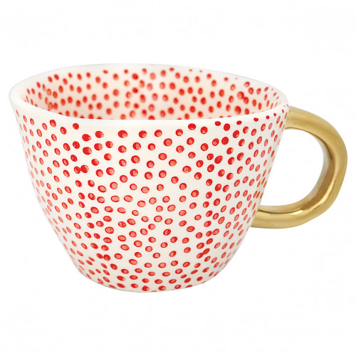 Ceramiczny kubek o nieregularnym kształcie w kolorze białym ozdobiony czerwonymi kropeczkami ze złotym uszkiem firmy Green Gate. Picie kawy lub herbaty z tej pięknej duńskiej ceramiki stanie się nie tylko doznaniem smakowym, ale i ucztą dla oczu. Kubek sam w sobie stanowi przeuroczą dekorację kuchni lub wspaniały prezent dla osób ceniących piękno i wysoką jakość przedmiotów codziennego użytku. Stworzy wyjątkowy zestaw z pozostałymi seriami porcelany Green Gate.
