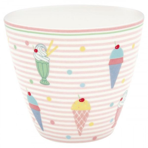 Porcelanowy kubek latte w kolorze biało-zielono-różowym ozdobiony rysunkami w paseczki firmy Green Gate. Picie kawy lub herbaty z tej pięknej duńskiej porcelany stanie się nie tylko doznaniem smakowym, ale i ucztą dla oczu. Kubek sam w sobie stanowi przeuroczą dekorację kuchni lub wspaniały prezent dla osób ceniących piękno i wysoką jakość przedmiotów codziennego użytku. Stworzy wyjątkowy zestaw z pozostałymi seriami porcelany Green Gate.