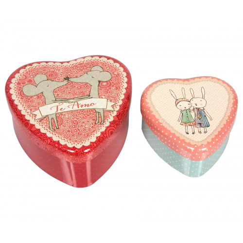 Zestaw dwóch pudełeczek w kształcie serduszka wykonanych z metalu z kolorowymi rysunkami duńskiej firmy Maileg. Wspaniały prezent dla osób ceniących piękno i wysoką jakość przedmiotów codziennego użytku. Stwórz wyjątkowy zestaw z pozostałymi seriami marki Maileg.