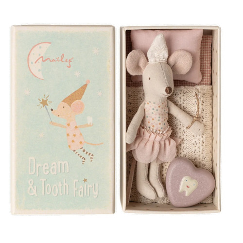 Myszka Zębowa Wróżka dziewczynka w pudełeczku w rozmiarze MINI duńskiej firmy Maileg. W nocy Wróżka Zębuszka rozsiewa magiczny pył, zbiera zęby, przynosi smakołyki i dba o słodkie sny. Ubrana w magiczny strój, śpi twardo w miękkiej pościeli – w zestawie pudełko na zęby i pudełko zapałek.