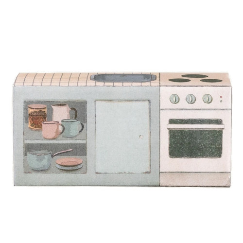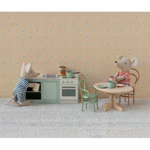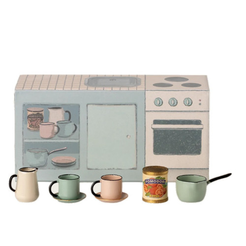 Kuchnia dla myszek od Maileg. Mały blat kuchenny jest wyposażony w 2 kubki i 2 talerze, garnek i dzbanek oraz małą puszkę. Mały zlew jest wykonany z metalu, aby wyglądał jak najbardziej realistycznie. Idealnie pasuje do kuchni w domku dla myszy SuitCasa.