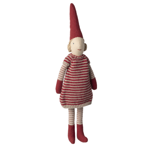 Skrzat PIXY w rozmiarze SIZE 1 GIRL No.1 ubrany w piękną świąteczną sukienkę, czerwoną czapeczkę, rękawiczki i skarpetki duńskiej firmy Maileg. Kolekcja Pixy Mailegs zawiera wiele różnych stylów – wszystkie ubrane w eleganckie świąteczne ubranka wykonane z ekskluzywnych materiałów. Są urocze i można je łączyć w różnych rozmiarach i kolekcjach. Rozmiar 1 ma magnes w rączkach i lewej stopie.