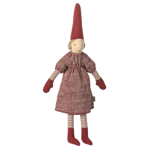 Skrzat PIXY w rozmiarze SIZE 2 Girl Red Dress ubrana w piękną świąteczną sukienkę, czerwoną czapeczkę, rękawiczki i skarpetki duńskiej firmy Maileg. Kolekcja Pixy firmy Mailegs zawiera wiele różnych stylów – wszystkie ubrane w piękne świąteczne ubrania wykonane z ekskluzywnych materiałów. Uroczo prezentują się w każdej świątecznej dekoracji i można je dowolnie łączyć w różnych rozmiarach i kolekcjach.