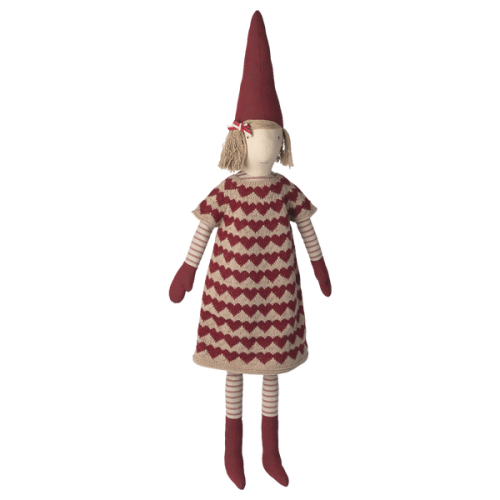 Skrzat PIXY w rozmiarze SIZE 5 Girl Knitted Dress ubrana w piękną świąteczną sukienkę, czerwoną czapeczkę, rękawiczki i skarpetki duńskiej firmy Maileg. Kolekcja Pixy firmy Mailegs zawiera wiele różnych stylów – wszystkie ubrane w piękne świąteczne ubrania wykonane z ekskluzywnych materiałów. Uroczo prezentują się w każdej świątecznej dekoracji i można je dowolnie łączyć w różnych rozmiarach i kolekcjach.