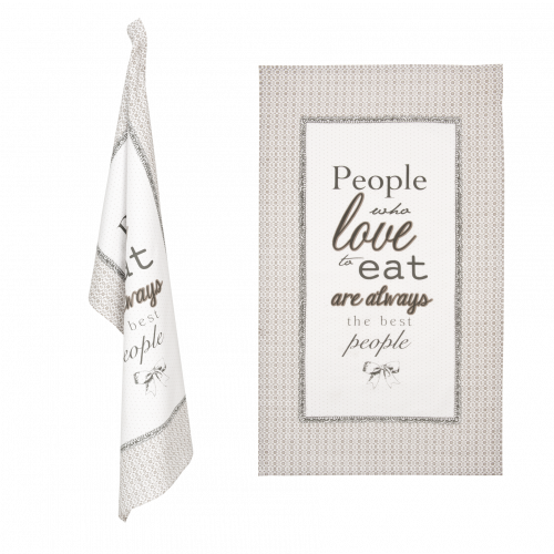 Bawełniany ściereczka kuchenna w kolorze biało-szarym ozdobiony napisem People Who Love To Eat Are Always The Best People holenderskiej firmy Clayre & Eef. Może być zarówno praktycznym dodatkiem do kuchni jak i pięknym elementem wyposażenia Twojej kuchni.