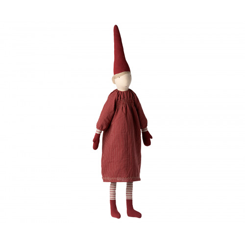 Skrzat dziewczynka PIXY GIRL MEGA ubrana w sukienkę, czerwoną czapkę, rękawiczki i skarpetki w rozmiarze MEGA duńskiej firmy Maileg. Skrzaty pochodzą z daleka. Uwielbiają podróżować, aby spędzić święta ze znajomymi i rodziną. Rodzina PIXY pochodzi z bardzo małego kraju na dalekiej północy. Pixies wędrują po wszystkich zakątkach świata, aby nieść radość Bożego Narodzenia. Uroczy i wyjątkowy skrzat wykonana z bardzo przyjemnego materiału. Wspaniały prezent dla osób ceniących piękno i wysoką jakość przedmiotów codziennego użytku. Stwórz wyjątkowy zestaw z pozostałymi seriami marki Maileg.