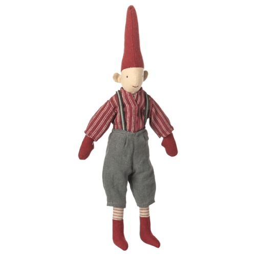 Skrzat PIXY w rozmiarze SIZE 2 BOY Red Shirt ubrany w piękne świąteczne ubranko, czerwoną czapeczkę, rękawiczki i skarpetki duńskiej firmy Maileg. Kolekcja Pixy firmy Mailegs zawiera wiele różnych stylów – wszystkie ubrane w piękne świąteczne ubrania wykonane z ekskluzywnych materiałów. Uroczo prezentują się w każdej świątecznej dekoracji i można je dowolnie łączyć w różnych rozmiarach i kolekcjach.