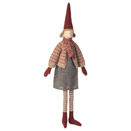 Skrzat PIXY w rozmiarze SIZE 4 Girl Skirt & Knitted Sweater ubrana w piękne świąteczne ubranko, czerwoną czapeczkę, rękawiczki i skarpetki duńskiej firmy Maileg. Kolekcja Pixy firmy Mailegs zawiera wiele różnych stylów – wszystkie ubrane w piękne świąteczne ubrania wykonane z ekskluzywnych materiałów. Uroczo prezentują się w każdej świątecznej dekoracji i można je dowolnie łączyć w różnych rozmiarach i kolekcjach.
