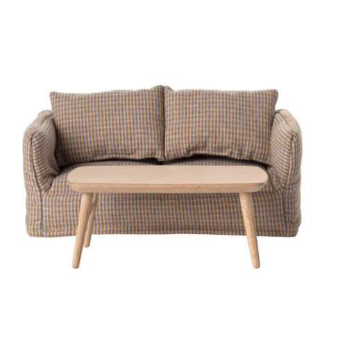Drewniany stolik kawowy idealnie dopasowany do sof w rozmiarze myszy. Stolik sprawdzi się w domu w stylu „Mysia dziura” i z pewnością będzie idealnym miejscem na przytulne spotkania przy herbacie lub kawie.