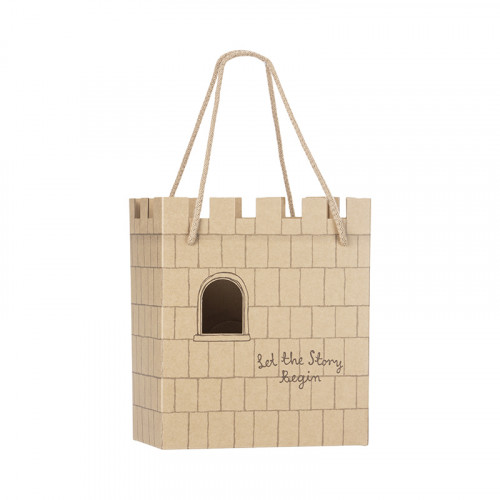 Torebka prezentowa wykonana z grubego kartonu w kształcie zamku księżniczki na ziarnku grochu w naturalnym kolorze kartonu duńskiej firmy Maileg. Świetna nie tylko do zapakowania prezentu, ale również do zabawy, jako domek dla myszek i przyjaciół.