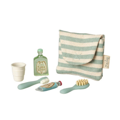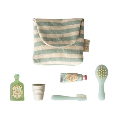 Mała torebka pełna wszystkiego, czego potrzeba przed snem: szczoteczka, pasta, kubeczek, szczotka do włosów i szampon. Idealna do tworzenia scenek i wielu opowieści o rodzinie myszek.