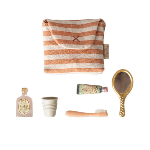 Mała torebka pełna wszystkiego, czego potrzeba przed snem: szczoteczka, kubeczek, lusterko, krem i buteleczka perfum. Idealna do tworzenia scenek i wielu opowieści o rodzinie myszek.